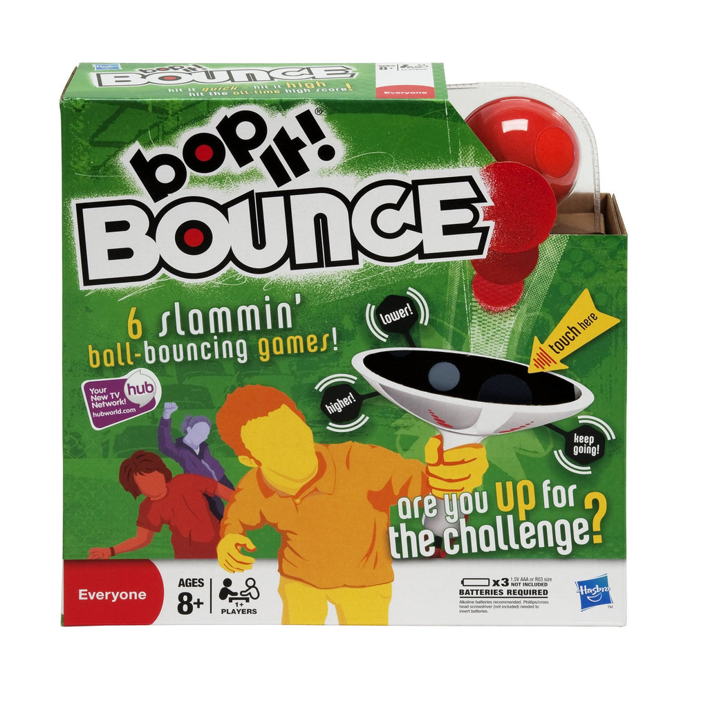 You've got to bounce your best to win in this awesome BOP IT Bounce game! This ball bounce game features an electronic voice command to cue you through six different challenging games: Max Bounce tests how fast you can bounce in 30 seconds, Infinite Bounce tests how long you can keep bouncing, Hang Time tests how high you can bounce, Right Height challenges you to match the shots called by the electronic voice, Little-Middle-Big challenges you to bounce at exactly the right height, and Free For All lets you bounce it out freestyle. Build your skills on your own or compete against your friends to find out who's the ultimate "Bounce Master"! Bop It! Bounce