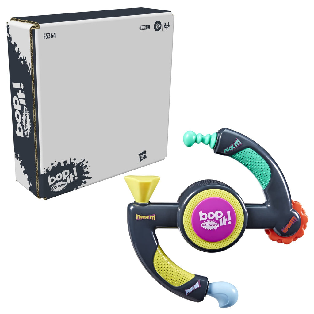 Details: Get ready to Bop It, Twist It, Pull It, Spin It, and Flick It with the Bop It! Extreme electronic game. This edition of the Bop It! game lets 2 players go head-to-head at the same time in One-On-One Mode. The interactive game also features other exciting modes including Pass it, Party, and Solo Modes. The suspense builds as players respond to the game unit's commands to score 100 points, and unlock even more extreme difficulty levels. It offers different levels of challenges making this a fun game for the novice as well as the pro. So grab the Bop It! Extreme game and get the party started -- the hardest part is putting it down! The game makes a great gift for adults, teens, and kids ages 8 and up. Hasbro Gaming and all related trademarks and logos are trademarks of Hasbro, Inc.